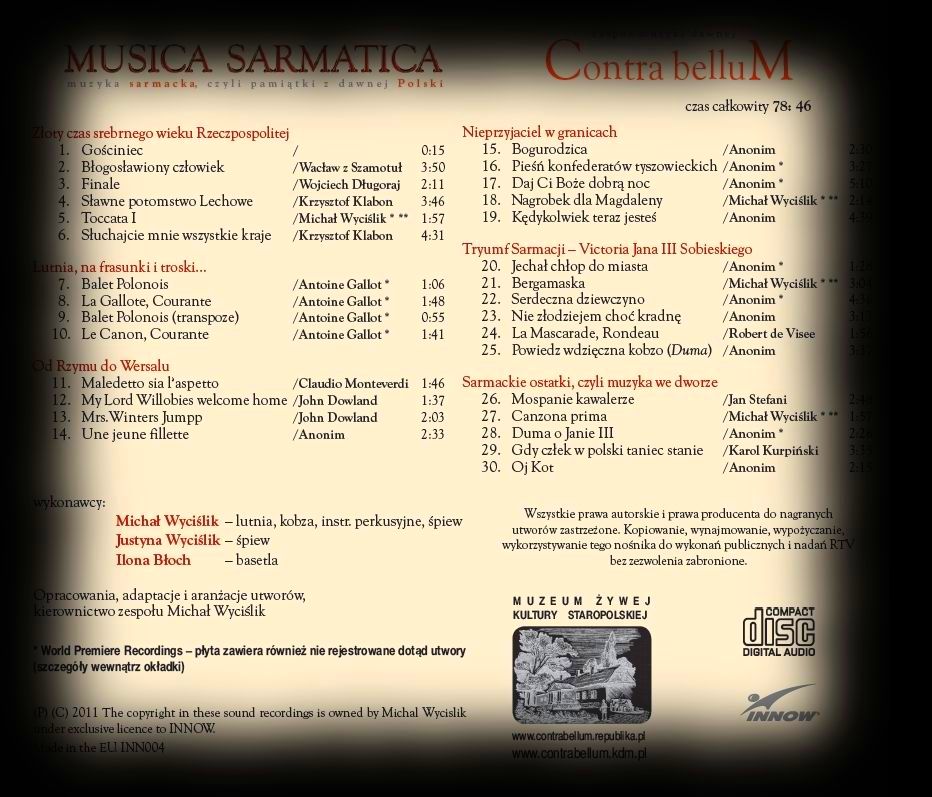 Płyta "Musica Sarmatica" jest muzyczną wędrówką i opowieścią o Sarmacji. Zawiera 30 utworów, wśród których znajdują się również dotychczas nigdy nie rejestrowane i nie publikowane, często zapomniane, staropolskie pieśni i muzyka instrumentalna. Zespół Contra belluM sięgnął do tych rzadko wykonywanych utworów, mając na celu przywrócenie pamięci o Sarmacji.